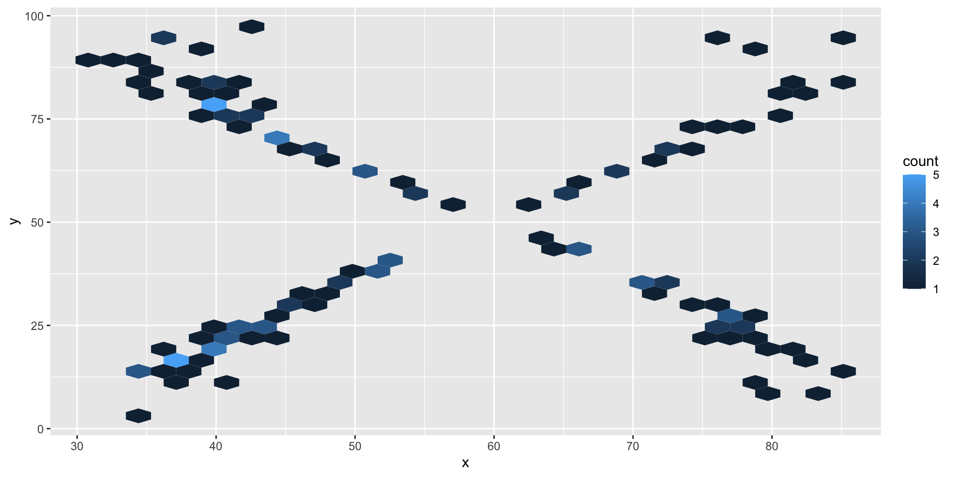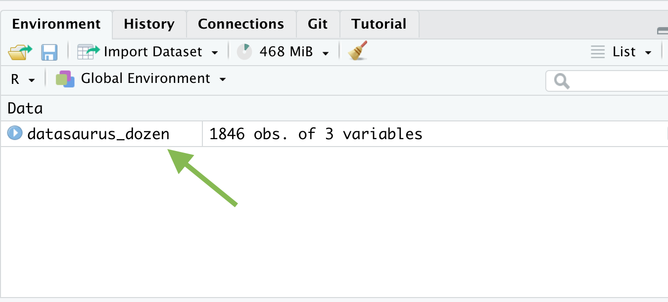 double Numbers c(1.5, 2, 3.12, 4)integer Whole numbers c(1, 2, 3, 4)character Text c("red", "banana")factor Category c("Yes", "Maybe", "No")Let’s grab one of the datasaurus_dozen datasets.