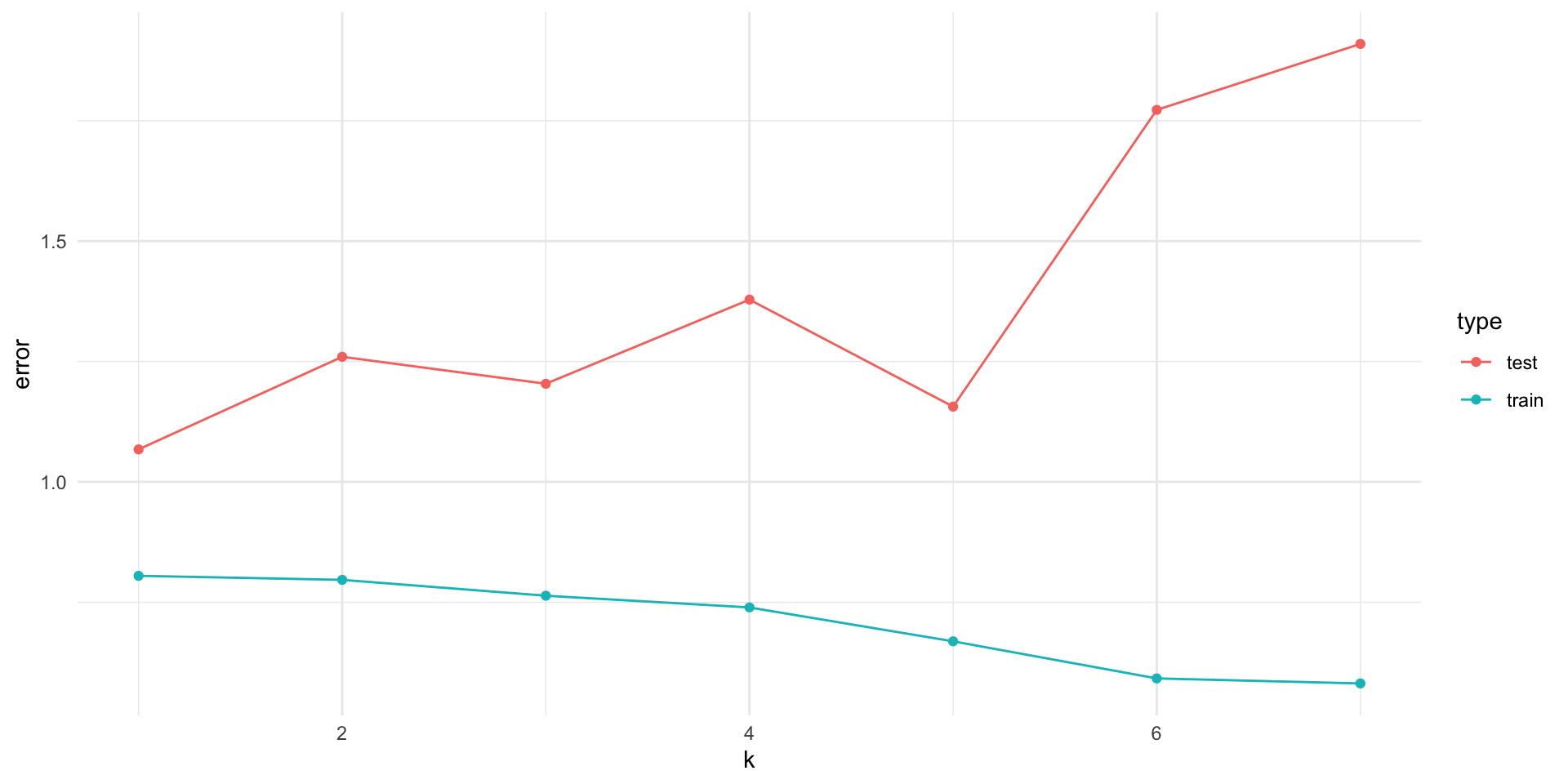 get_error <-function(k) { train <- d_samp1 %>%sample_n(19) test <- d_samp1 %>%anti_join(train, by =c("x1", "x2", "x3", "x4", "x5", "x6", "x7", "y")) form <-as.formula(glue("y ~ {glue_collapse(glue('x{1:k}'), sep = ' + ')}" )) mod <-lm(form, data = train)tibble(error =c(mean(residuals(mod)^2), mean((test$y -predict(mod, test))^2)),type =c("train", "test"),k = k )}set.seed(1)err <-map_df(rep(1:7, each =100), get_error) err %>%group_by(k, type) %>%summarise(error =mean(error)) %>%ggplot(aes(x = k, y = error, color = type)) +geom_point() +geom_line()