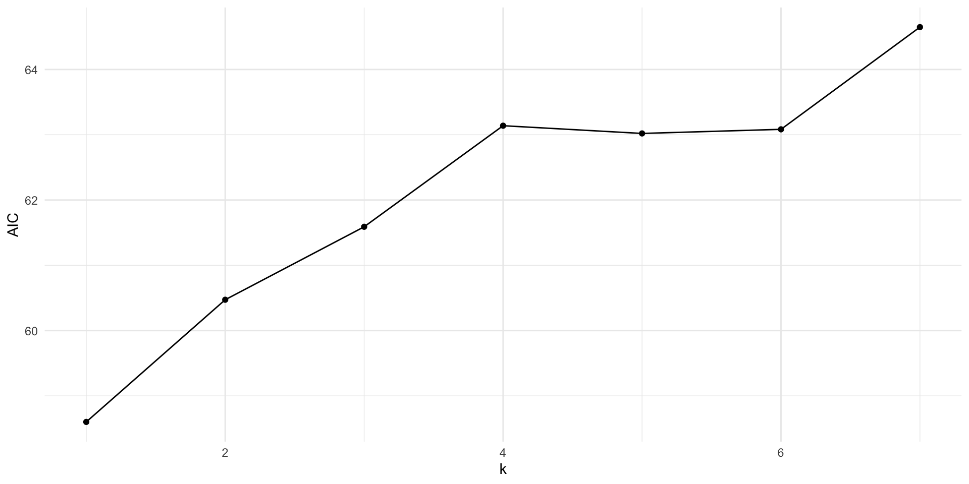 get_aic <-function(k) { form <-as.formula(glue("y ~ {glue_collapse(glue('x{1:k}'), sep = ' + ')}" )) mod <-lm(form, data = d_samp1)tibble(AIC =AIC(mod),k = k )}err <-map_df(1:7, get_aic)err %>%ggplot(aes(x = k, y = AIC)) +geom_point() +geom_line()