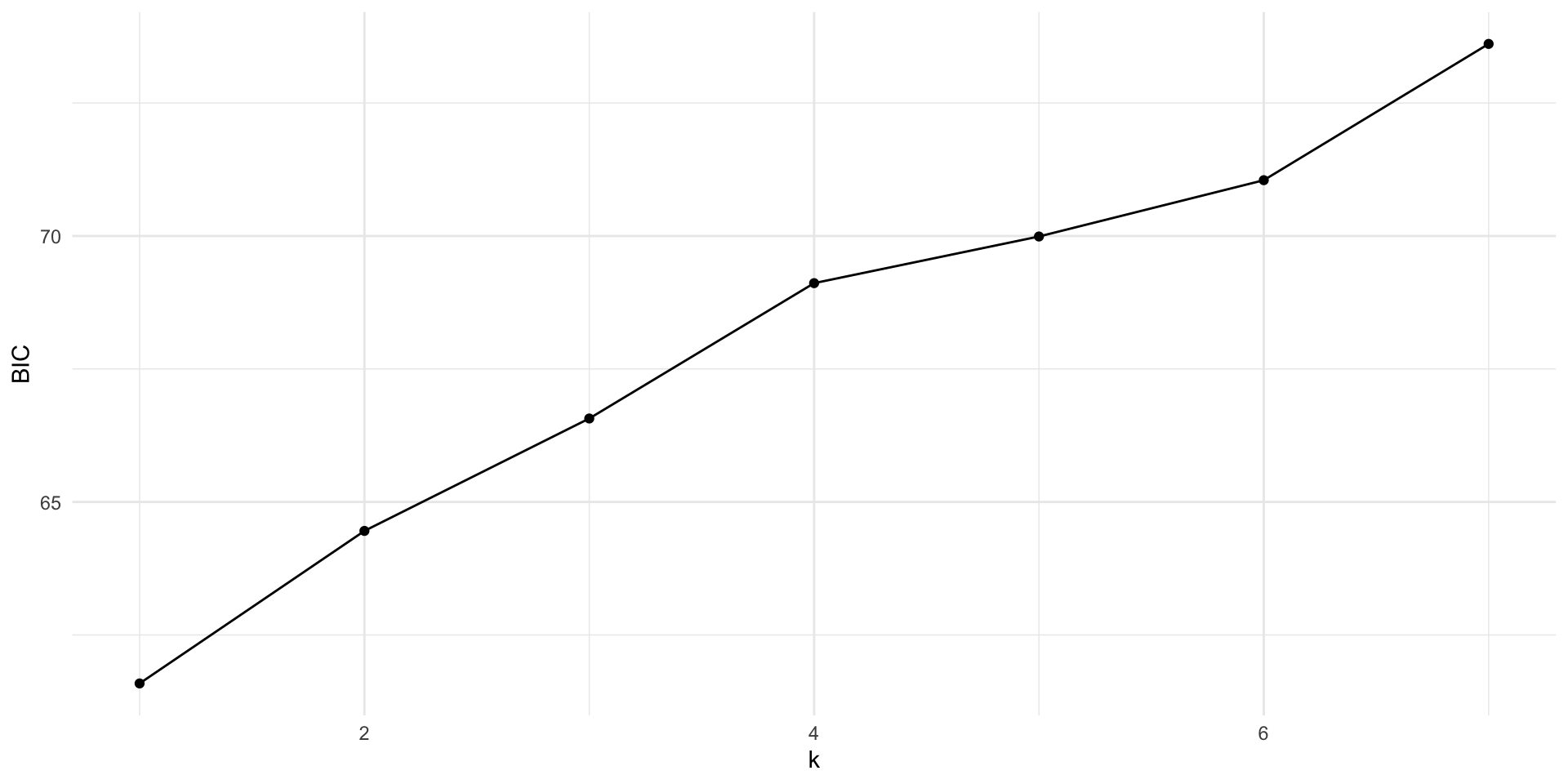 get_bic <-function(k) { form <-as.formula(glue("y ~ {glue_collapse(glue('x{1:k}'), sep = ' + ')}" )) mod <-lm(form, data = d_samp1)tibble(BIC =BIC(mod),k = k )}err <-map_df(1:7, get_bic)err %>%ggplot(aes(x = k, y = BIC)) +geom_point() +geom_line()